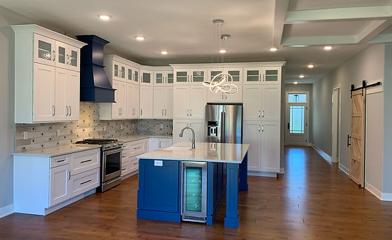 Stone Point fuses classic farmhouse character with sleek, modern touches. The kitchen stands out with a bold cobalt blue island and custom cabinetry. In the primary bath, a spa-inspired wet room with a freestanding tub and floor-to-ceiling tile transforms the space into a tranquil retreat. Every element is designed for beauty and functionality.